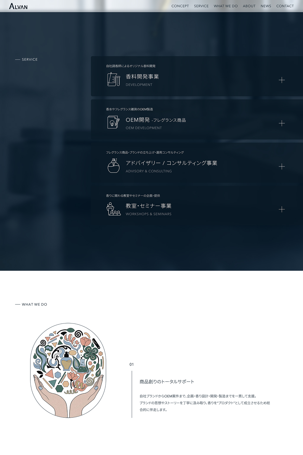 「香り」を感じさせる情緒的なブルートーン: サイト全体を、深みのあるブルーを基調とした静謐なトーンで統一しました。ALVAN様の知的な専門性と、香りが心に染み渡っていくような情緒的な雰囲気を両立。スタイリッシュでありながら、どこか懐かしさを感じさせる、独自の世界観を作り上げました。