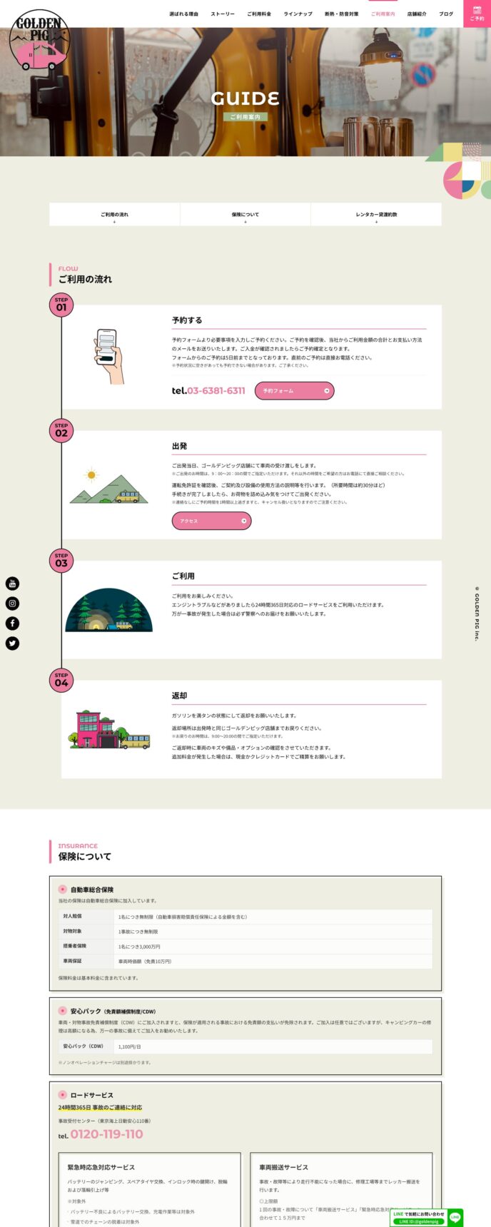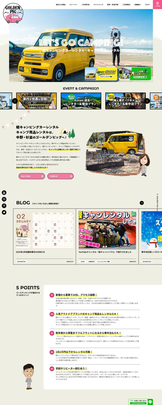 東京都杉並区の軽キャンピングカー・レンタル会社「ゴールデンピッグ」様のサイト制作では、キャンピングカーならではの楽しさや冒険心を感じさせるビジュアルデザインと、SEOを重視したライティングを両立。