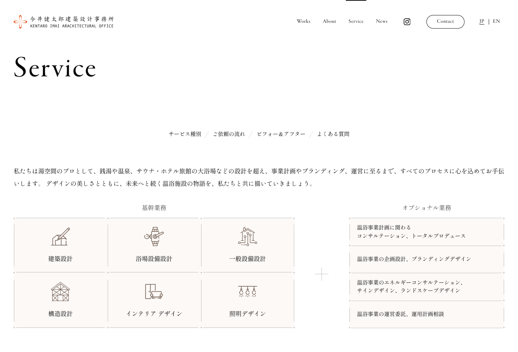 株式会社今井健太郎建築設計事務所様のウェブサイト制作では、都内での建築設計や温浴施設設計における同社の魅力を最大限に引き出すデザインと、ユーザーの利便性を重視した機能を両立させました。