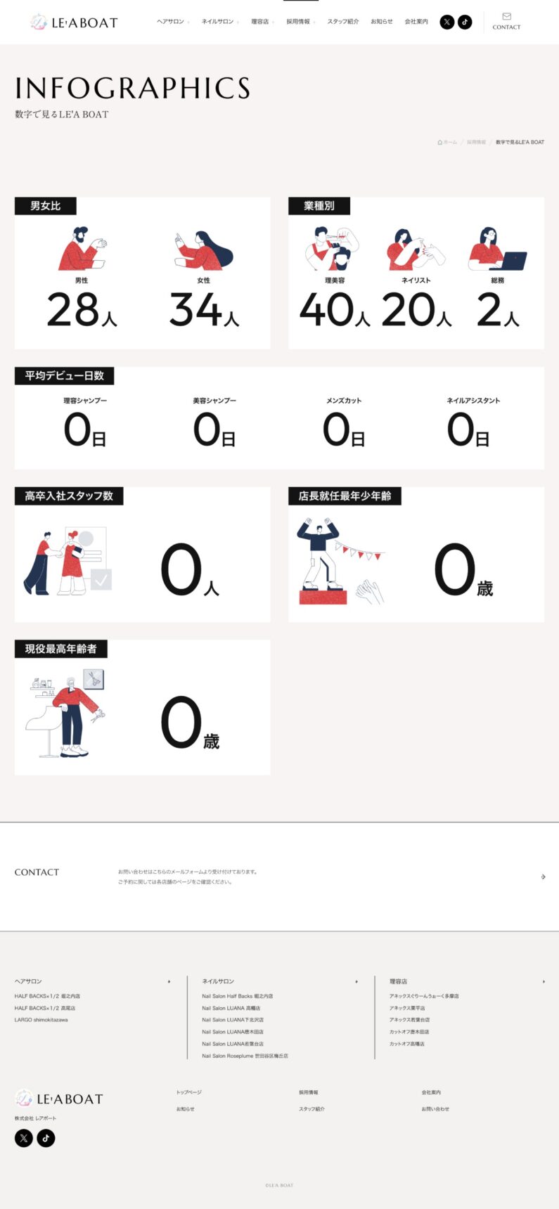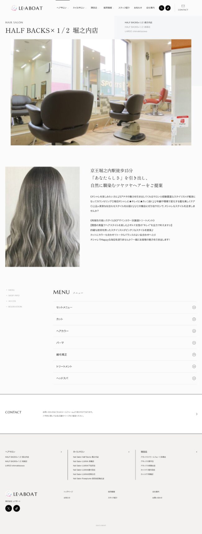 次世代の美容ビジネスを展開する株式会社 LE'A BOAT様のコーポレートサイト兼採用サイトを制作しました。東京都内に14店舗を構え、ヘアサロン・ネイル・理容店と幅広いサービスを提供する企業としての魅力を、視覚的にも機能的にも伝わるデザインに仕上げています。