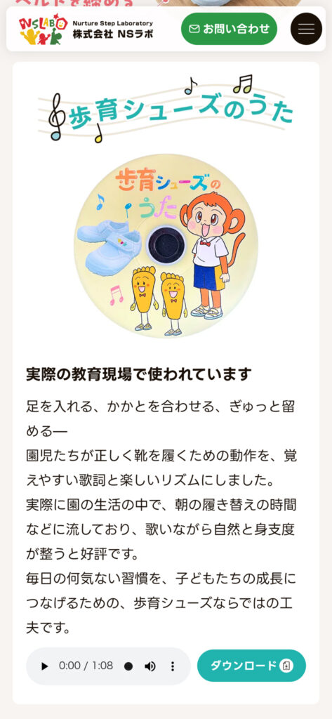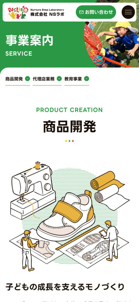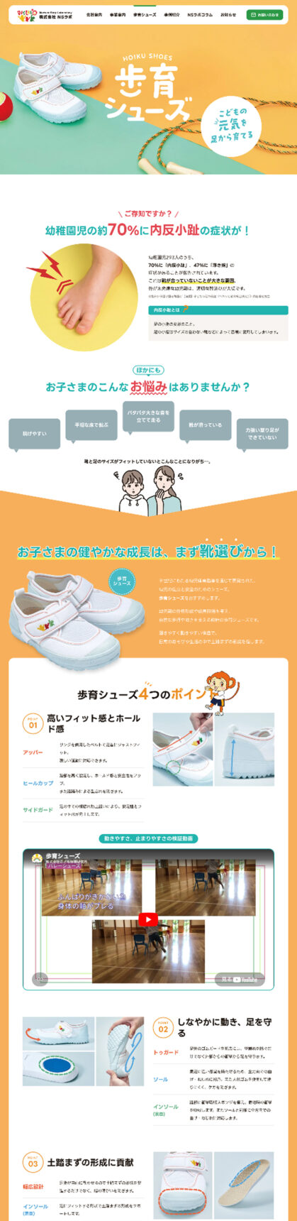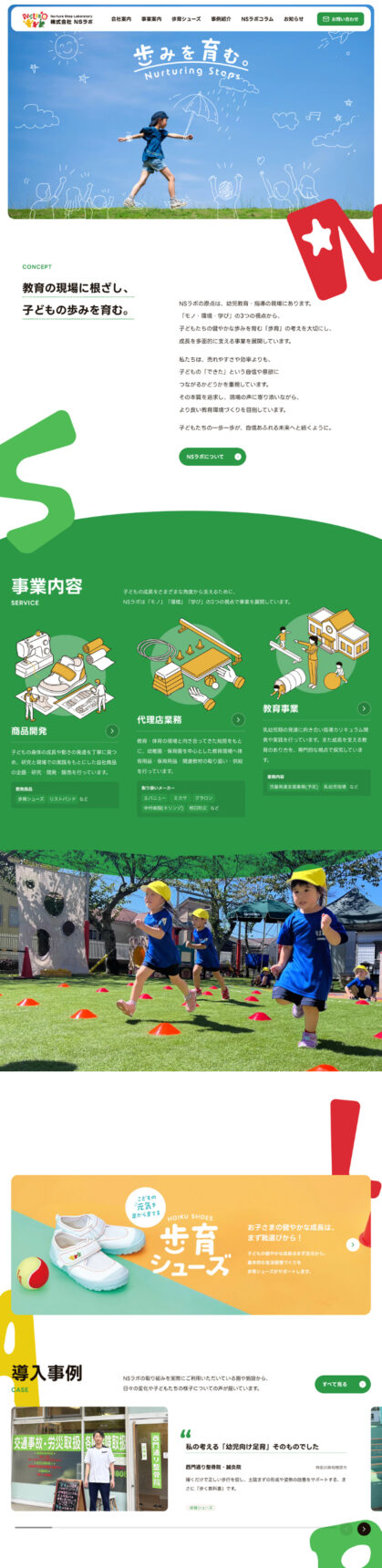 自社開発の『歩育シューズ』の展開をはじめ、幼稚園・保育園への体育備品の提供、教育環境のデザインなど、多角的に子どもたちの未来をプロデュースされています。今回のプロジェクトでは、多岐にわたる事業の根底にある「子どもの歩みを支えたい」という想いを、Webサイトを通じて形にしました。