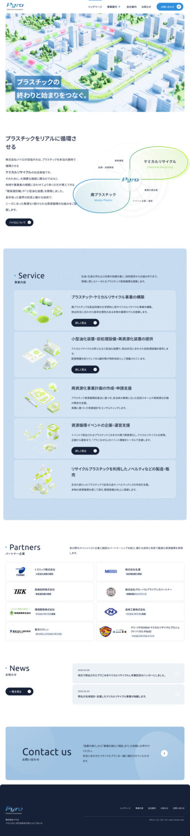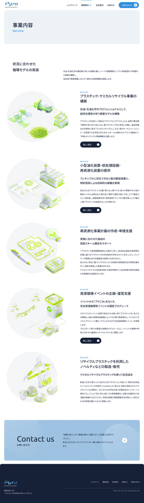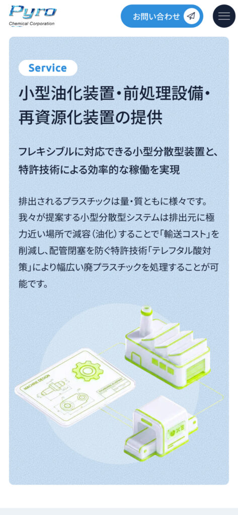 3D調のイラストで描く「資源循環の街」: メインビジュアルや事業紹介には、奥行き感のある3Dスタイルのイラストを採用しました。リサイクルの工程をリアルな写真で見せるのではなく、清潔感のある街並みの中で資源が巡る様子を「未来的なジオラマ」のように表現。これにより、難しい技術内容を直感的に、そして楽しみながら理解してもらえる構成にしています。