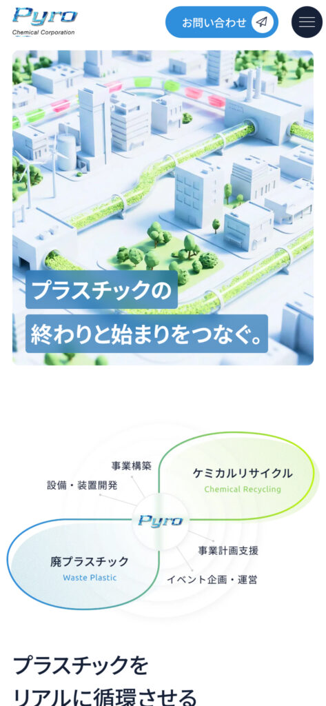 最先端の技術を扱う企業として、その専門性の高さをしっかりと伝えつつ、 まだ世の中に浸透していない新しいリサイクル技術を、どのようにして「自分たちの暮らしに関係のあること」として届けるか。その解決策として、視覚的な分かりやすさと先進性を両立させたサイト構築をしました。